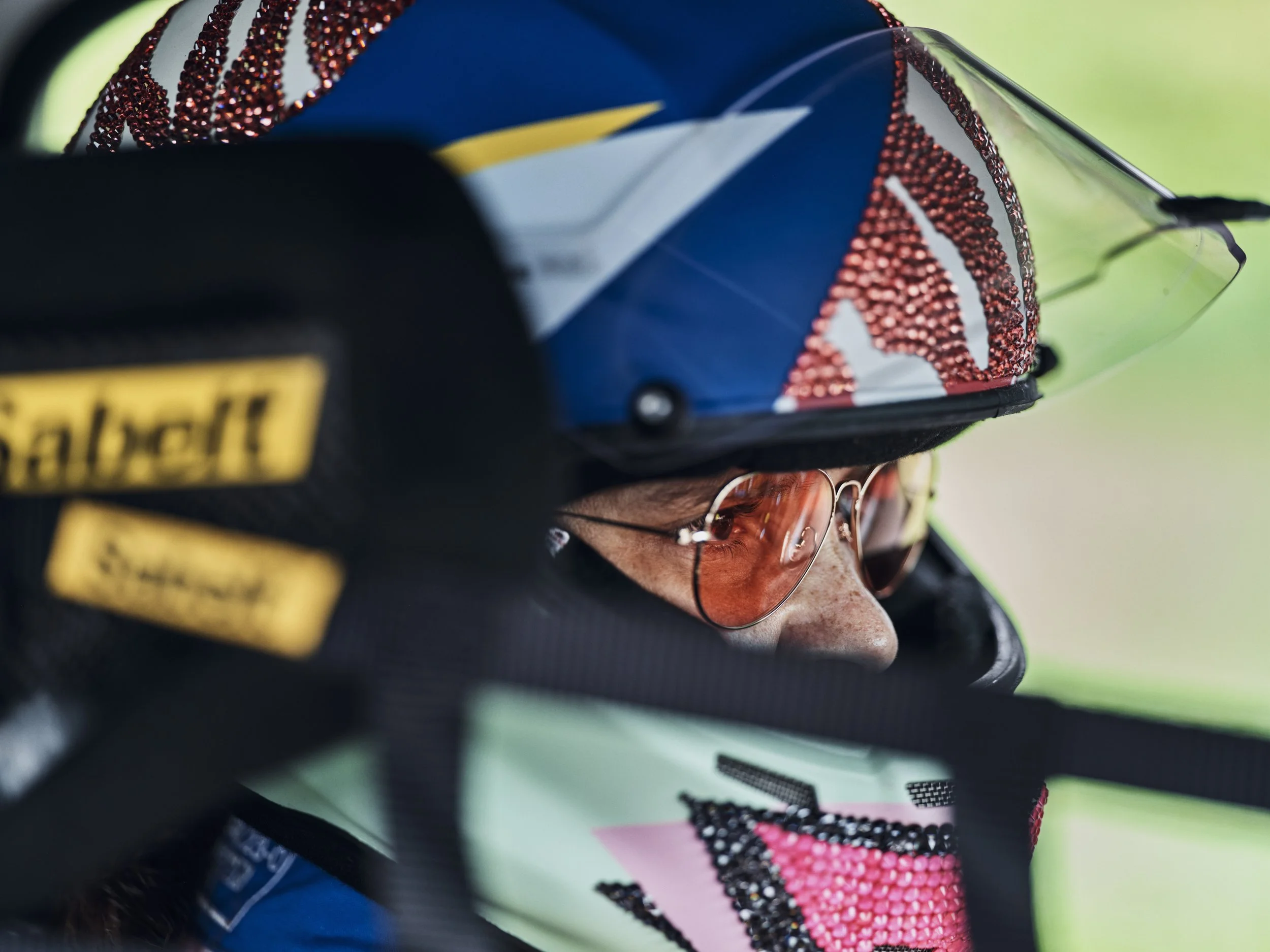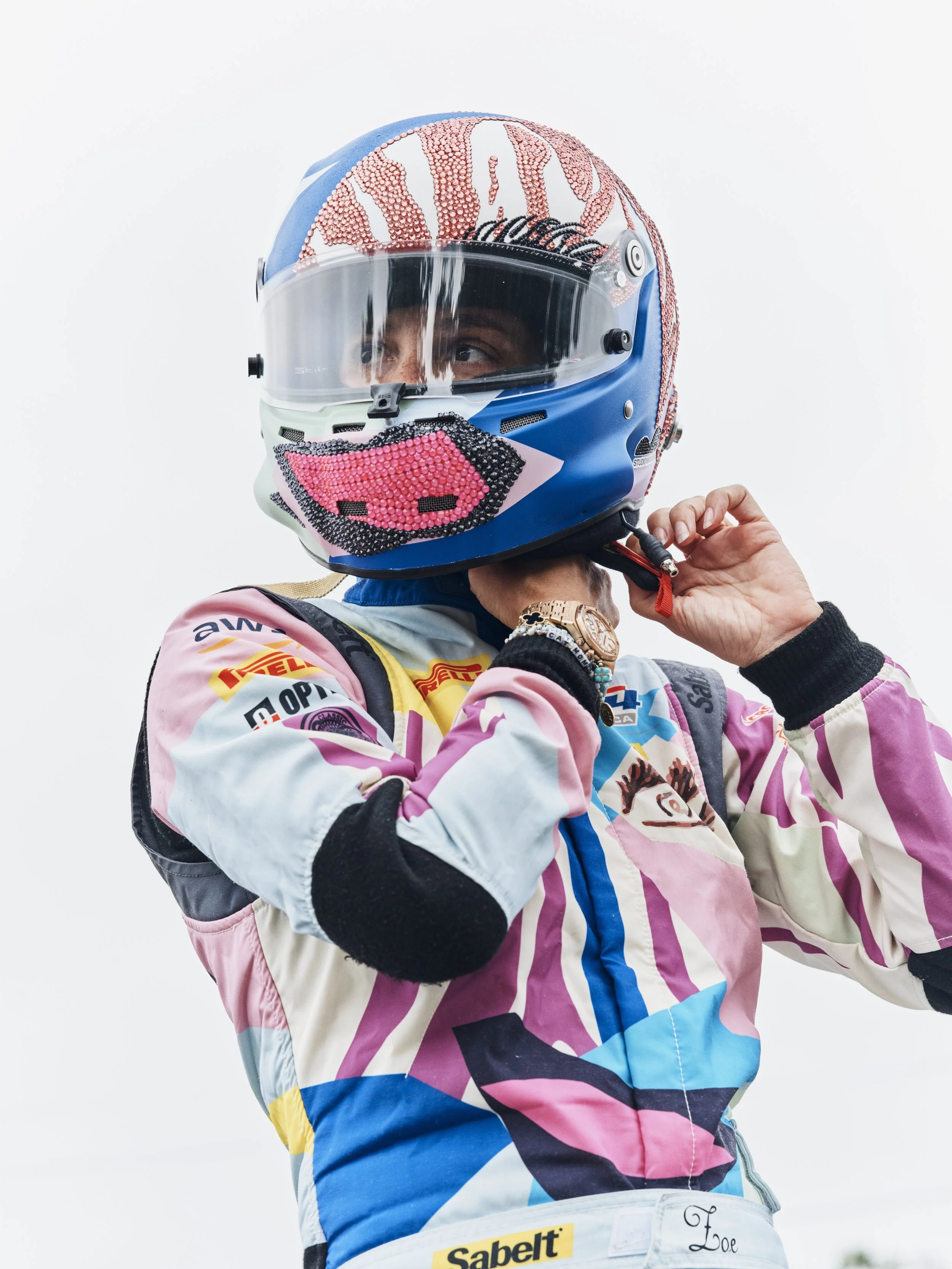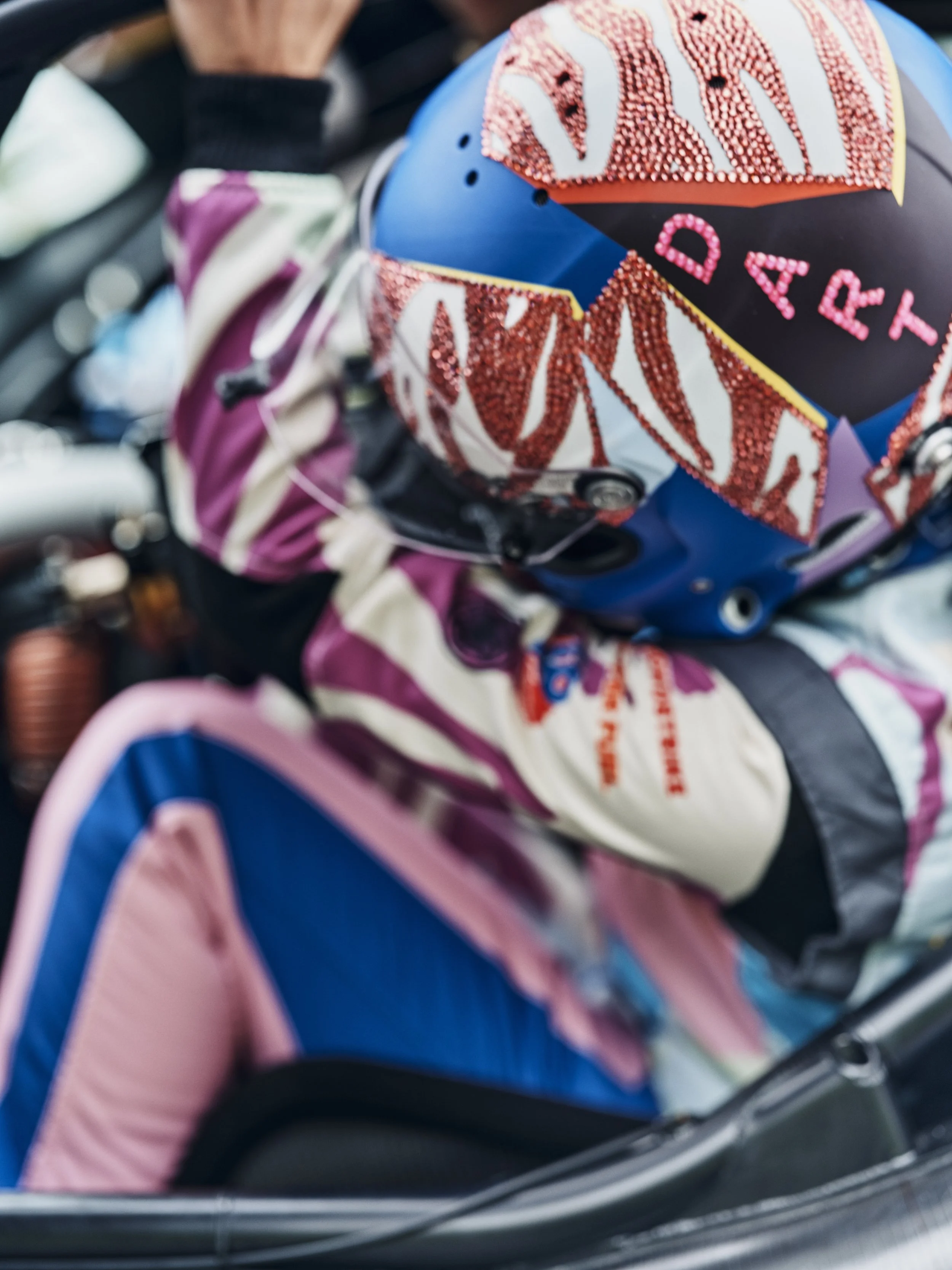 That visual language carried through everything—the car, the helmets, the race suits, all with those lips. Mickalene jokes they’re “for all the kisses in all the special places.” It’s playful, but it resonates. People love it. And not just women—men too. You’d expect women to gravitate toward hot pink and crystals, but when the car was being wrapped in a private garage, collectors kept coming through asking for photos. And it wasn’t just collectors. When we went to the tech inspection, the crew—not museum-goers or gallery regulars—were holding the helmet like it was a treasure. At that time, none of us knew how the market would respond, but then my first helmet sold at auction at Silverstone, during the F1 event in July, for $150,000. Since then, collectors have been snapping up DART pieces, and that’s the mission: every sale funds more driving, gets more women behind the wheel, and raises visibility for female artists.