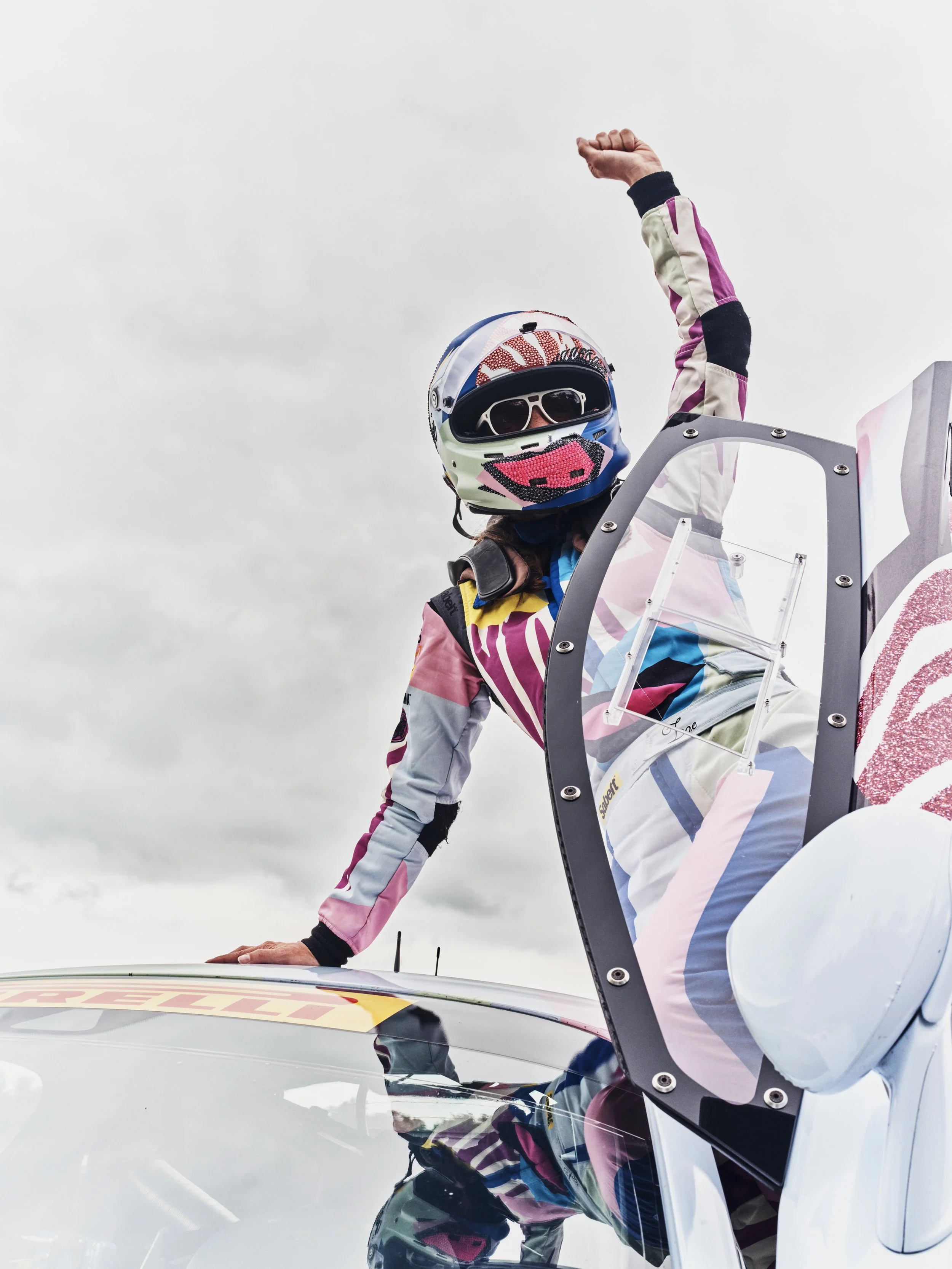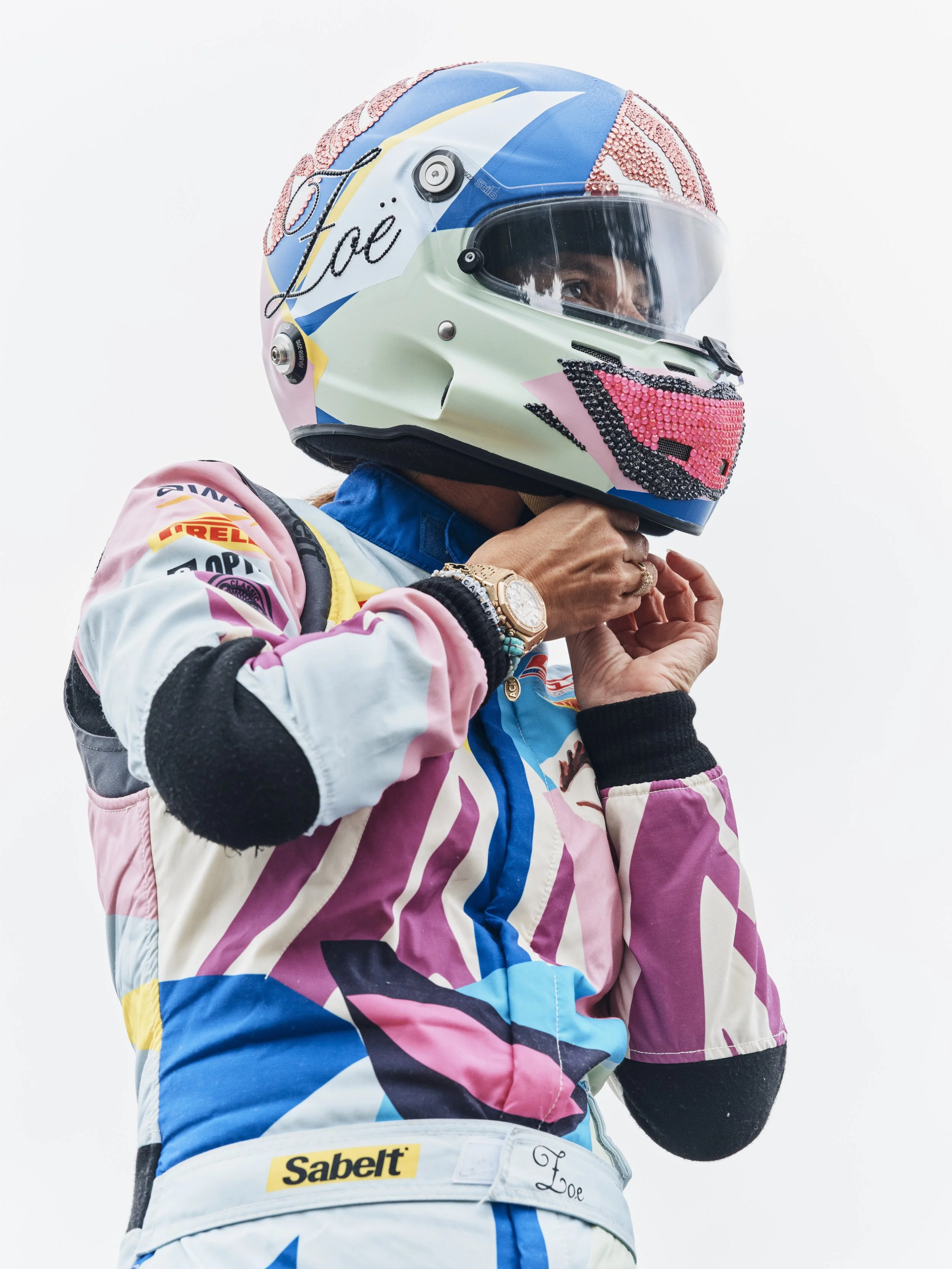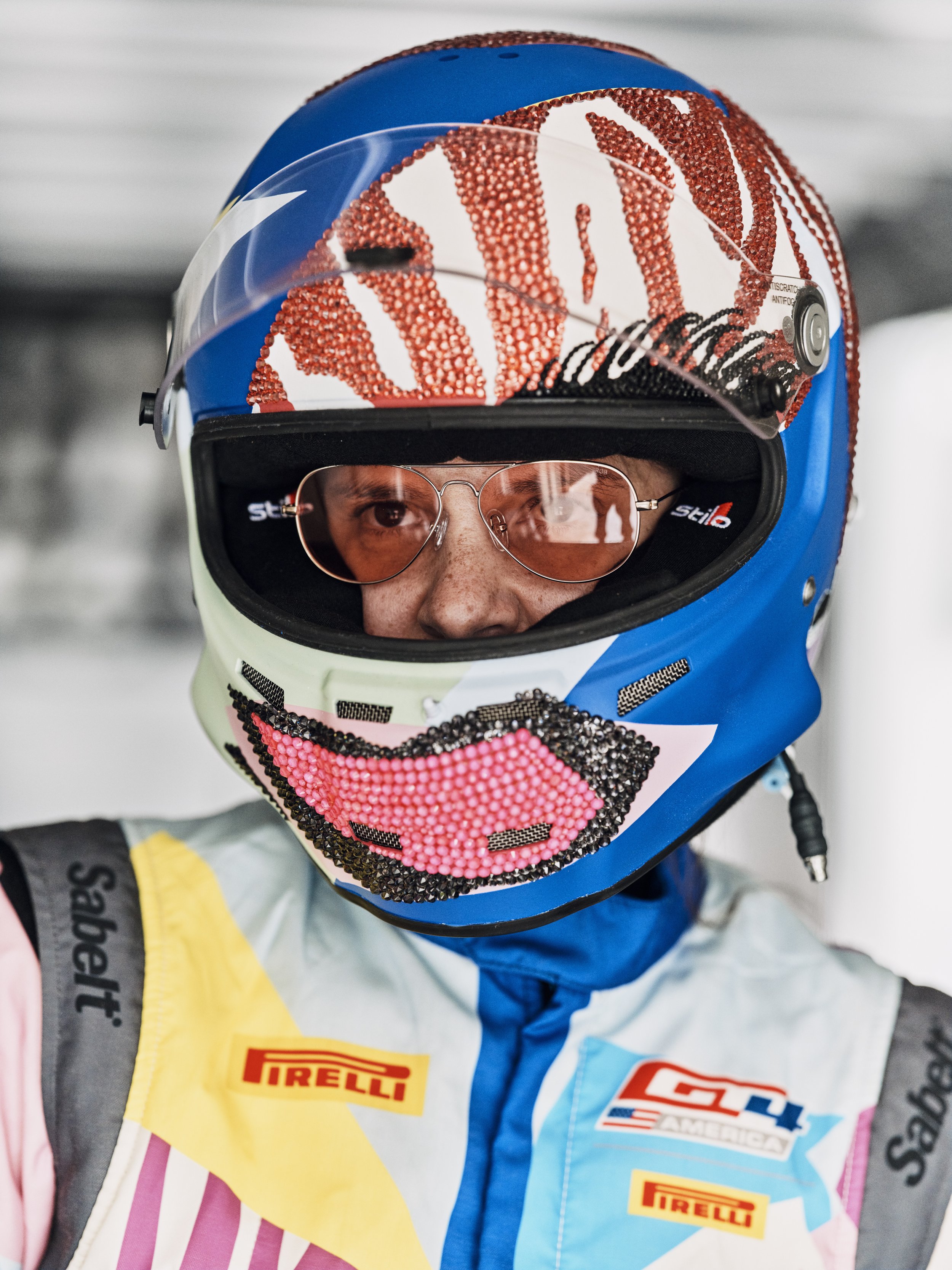 That visual language carried through everything—the car, the helmets, the race suits, all with those lips. Mickalene jokes they’re “for all the kisses in all the special places.” It’s playful, but it resonates. People love it. And not just women—men too. You’d expect women to gravitate toward hot pink and crystals, but when the car was being wrapped in a private garage, collectors kept coming through asking for photos. And it wasn’t just collectors. When we went to the tech inspection, the crew—not museum-goers or gallery regulars—were holding the helmet like it was a treasure. At that time, none of us knew how the market would respond, but then my first helmet sold at auction at Silverstone, during the F1 event in July, for $150,000. Since then, collectors have been snapping up DART pieces, and that’s the mission: every sale funds more driving, gets more women behind the wheel, and raises visibility for female artists.