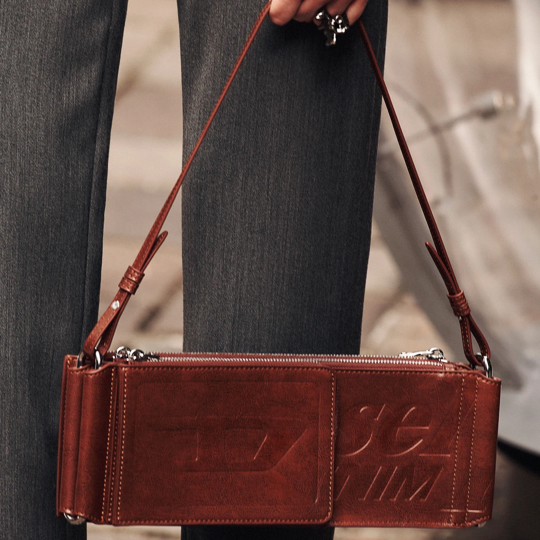 Accessories become characters in this story. Bags sit at a midpoint between sculpture and utility, and some are treated almost like wearable secrets with compact shapes that ask the viewer to come closer. Silver shoes and buckled heels ground the looks in a crisp present tense while futuristic jewelry sits high on the collarbone like talismans from a world where fashion and survival share the same language. Every piece is a reminder that attitude requires an object to anchor itself in the real. Diesel offers those anchors with confidence and mischief.