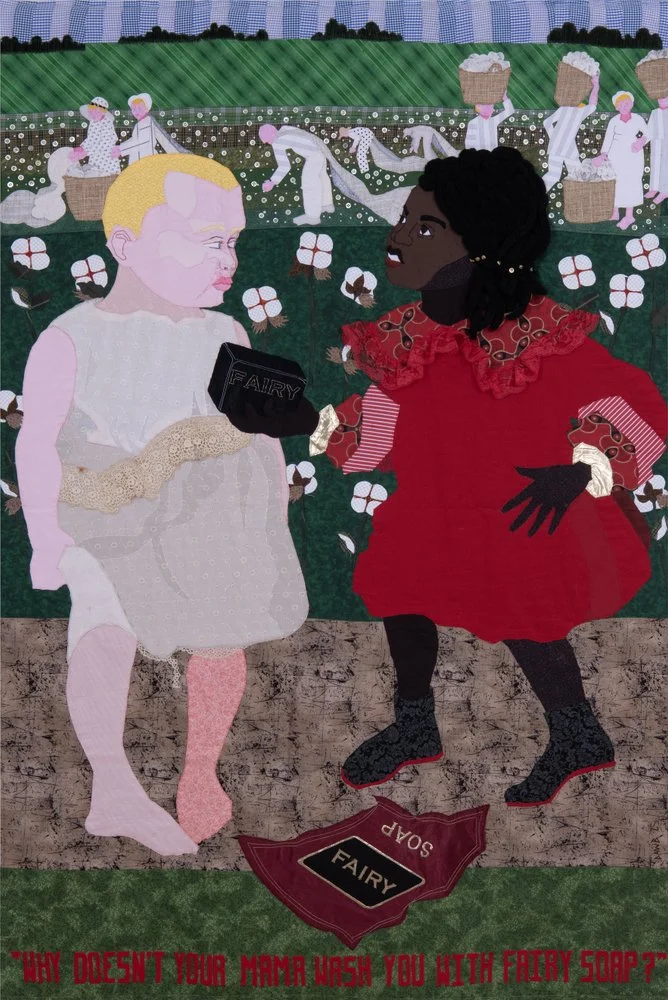 More than 150 years after the de jure end of slavery in America, economic and social inequalities persist. In keeping with this reality, Boyd’s textile works generally proceed chronologically through history, but they offer no hint of progress toward integration or equality; the racial divide remains unambiguous. She further underscores the role of seemingly benevolent industries, like entertainment and medicine, in perpetuating racial inequality. We see white subjects forced into society’s most exploited roles, from dancing in banana skirts in service of the ruling class (at a Prohibition era nightclub in Harlem), to being the subjects of gruesome gynecological research (imitating the work of Marion Sims, the “father of gynecology” who performed studies on enslaved Black women). In the real world, Black patients disproportionately lack access to the advances their exploitation made possible.
