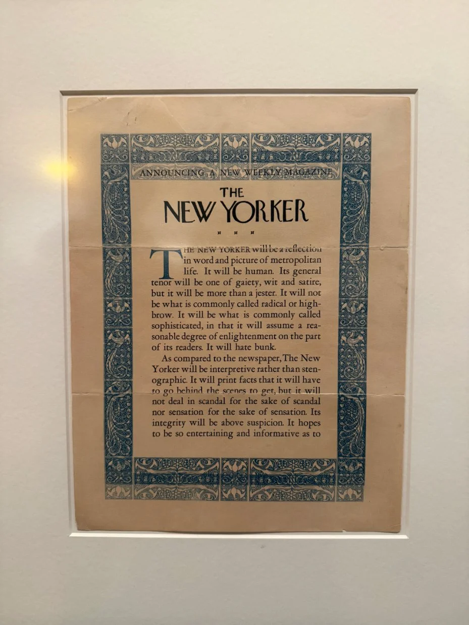 The first section of the exhibit, titled “Beginnings,” opens with the story of husband and wife Harold Ross and Jane Grant launching The New Yorker on February 21, 1925, with the original cover illustration by art editor Rea Irvin—the progenitor of Eustace Tilly aka “The Man with the Monocle.” Through the monocle, Tilly stares at a pink-and-purple butterfly flying about, and with this subtly defiant gesture, a semiotic celebrity was born, thus codifying the magazine’s righteous charge in the pursuit of erudite musings. Here we also see The New Yorker prospectus, written in 1924, where Ross famously declared, “The New Yorker will be the magazine which is not edited for the old lady in Dubuque.” While one might argue this is a hilariously serious sentiment, Ross made his intent to edit a weekly for the unapologetically intellectual.