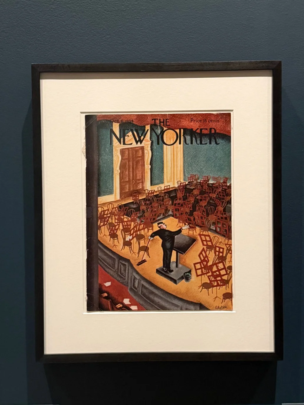 On October 6, 1934, Charles Henry Alston, one of the magazine’s first Black artists to illustrate the cover, drew a janitor conducting an empty orchestra, wielding a mop as his baton. Chairs are thrown everywhere, yet no one else is seen, emphasizing the ubiquity of human ambition, the realization and sharing of which is often only afforded to the privileged few. Alston’s work centered on the Black artists working behind the scenes, who seldom received the credit or fruits of their labor. The New Yorker at this time was mainly made up of a white staff who wrote and drew for white readers; however, this inclusion represented a small stride forward in their stutter-stepping evolution.