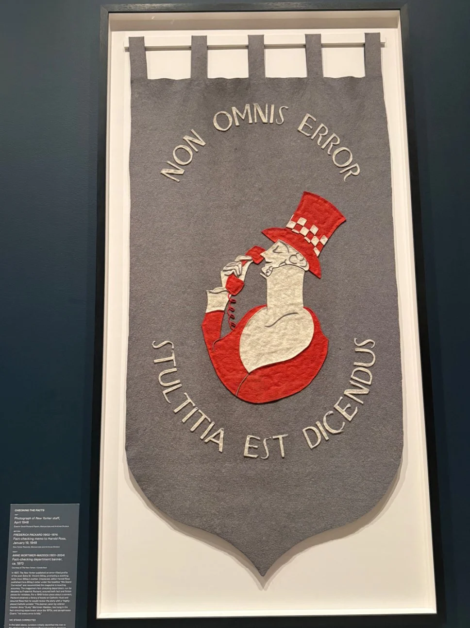 One of my favorite pieces within this section is from 1927, when the magazine published a profile of the notorious feminist poet Edna St. Vincent Millay that was riddled with errors. Millay’s mother wrote a letter to The New Yorker complaining about the falsehoods, which Ross later published under the title “We Stand Corrected.” Later, in 1970, fact-checker Anne Mortimer-Maddox made a hand-sewn banner featuring Eustace Tilly on the phone with the Latin phrase “Non omnis error stultitia est dicendus,” which translates to “Not every error is folly.” This banner has hung in the fact-checking department ever since, along with a sign that reads “Better perfect than done,” emphasizing their commitment to responsible journalism and correcting their errors.