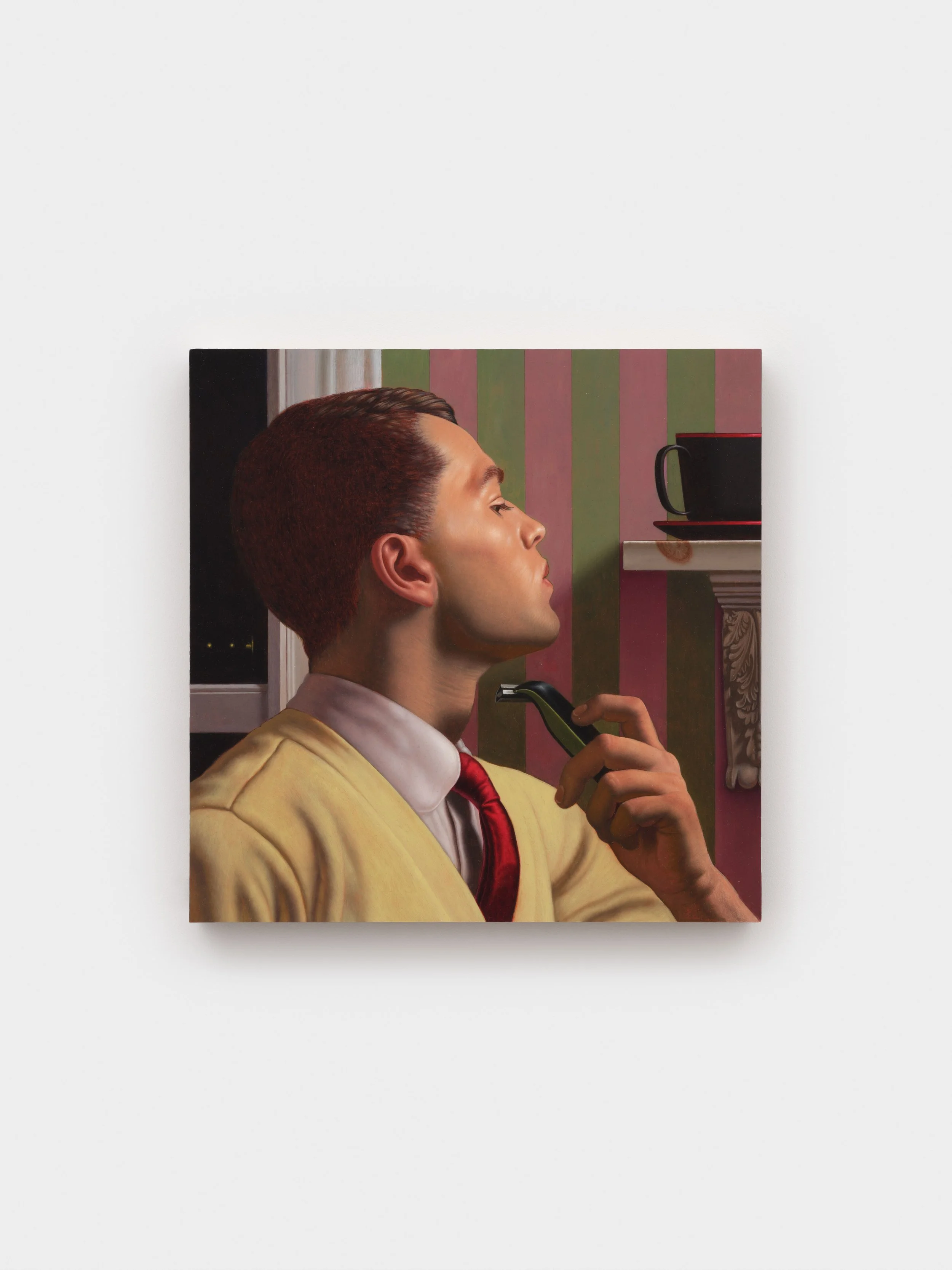 In Watching Men #10, a young man holds a razor to his neck, gaze fixed on the reflection outside the bounds of the canvas. He wears a yellow v-neck sweater layered over a white button-down, and a red tie tucked loosely underneath. He looks like he could wander into a 1950s romantic comedy and no one would know the difference.