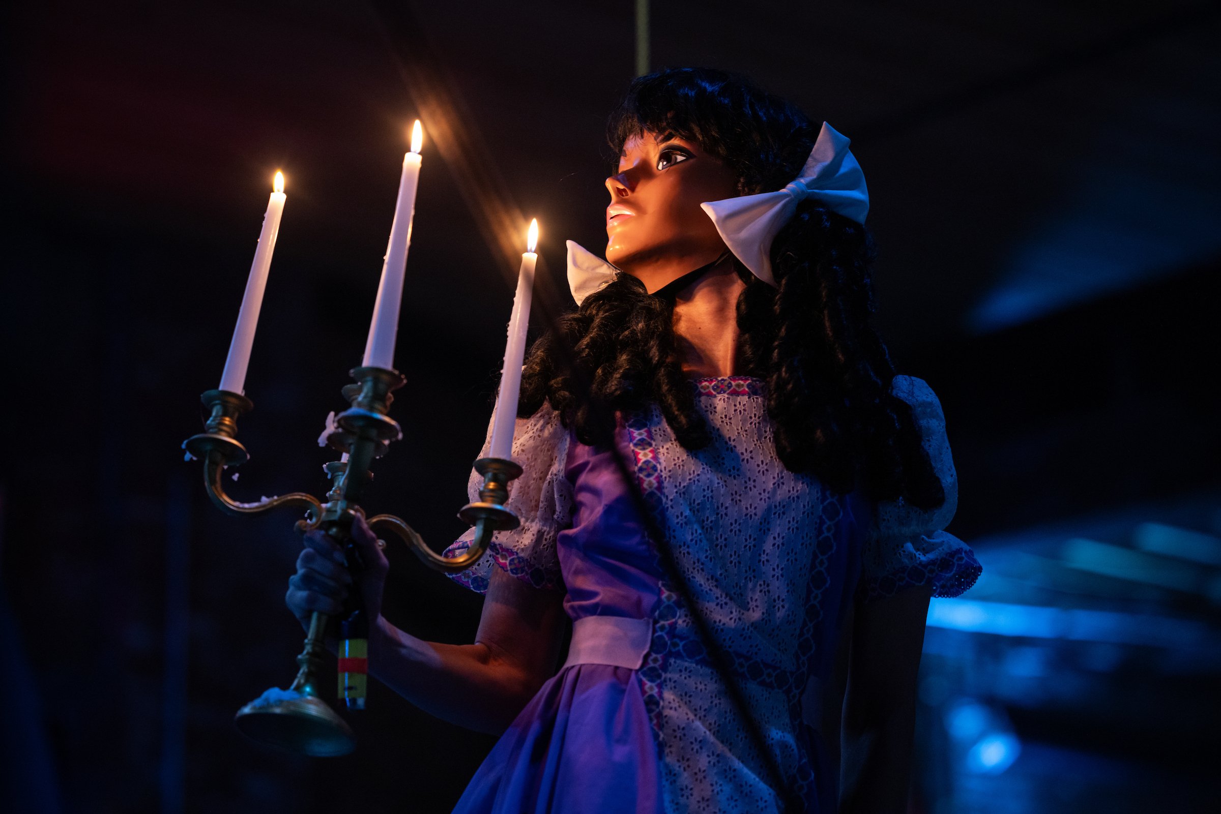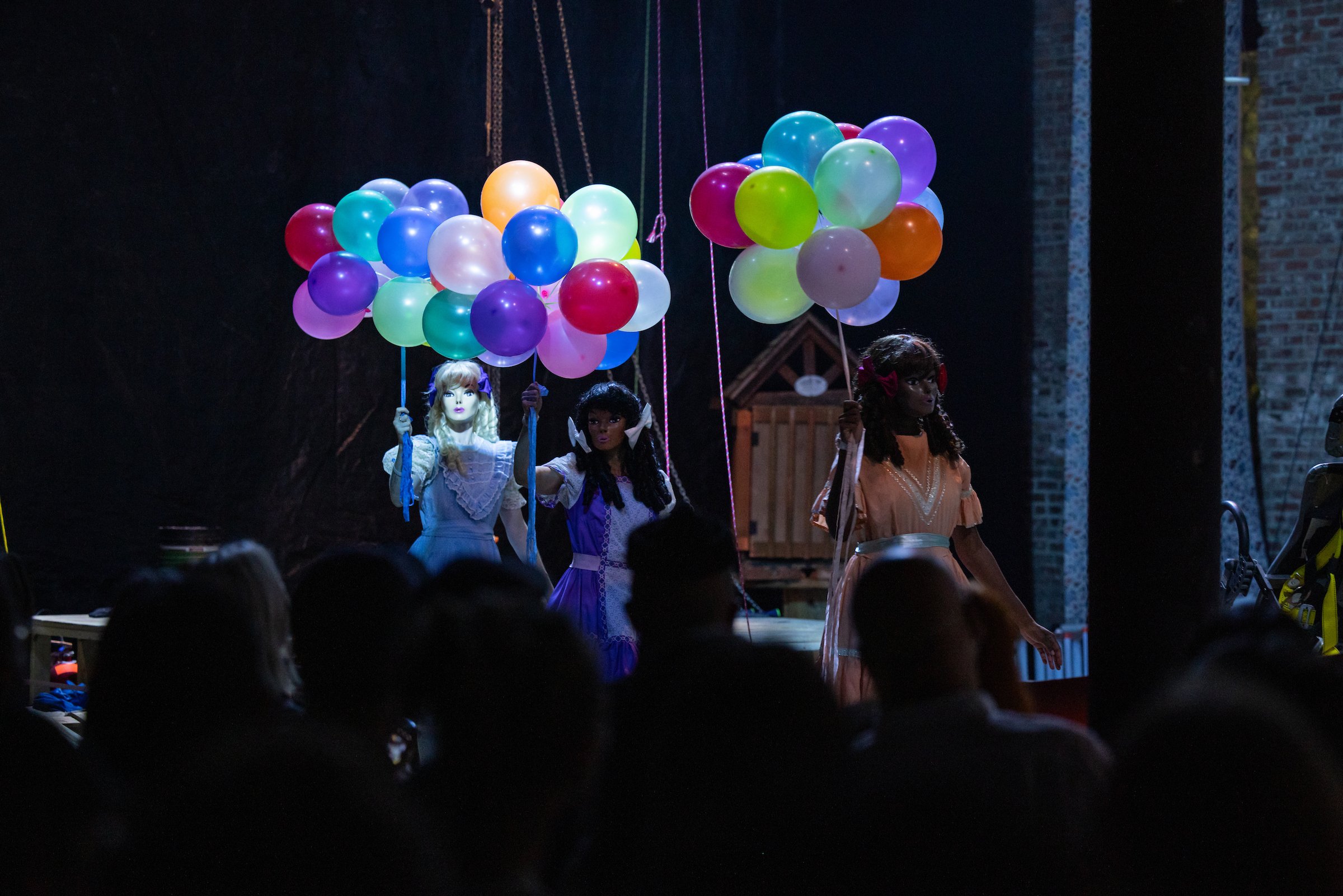 The most unforgettable image arrives at the end of the show, following a wonderful musical interruption by Holland Andrews and a live band. The three characters line up near the edge of the stage, wearing their dresses again, and hold an absurdly long string with a bundle of colorful balloons attached. They pull the string down and begin popping every balloon with their bodies. At times, their actions look like convulsions, bursts of energy wholly committed to wrecking. Why inflate balloons only to obliterate them? Why stack a pyramid of buckets only to push it over? Unsurprisingly, these questions go unanswered. In Narcissister’s refusal to provide meaning, she ends up rattling your faith in it. Why do we do anything at all?