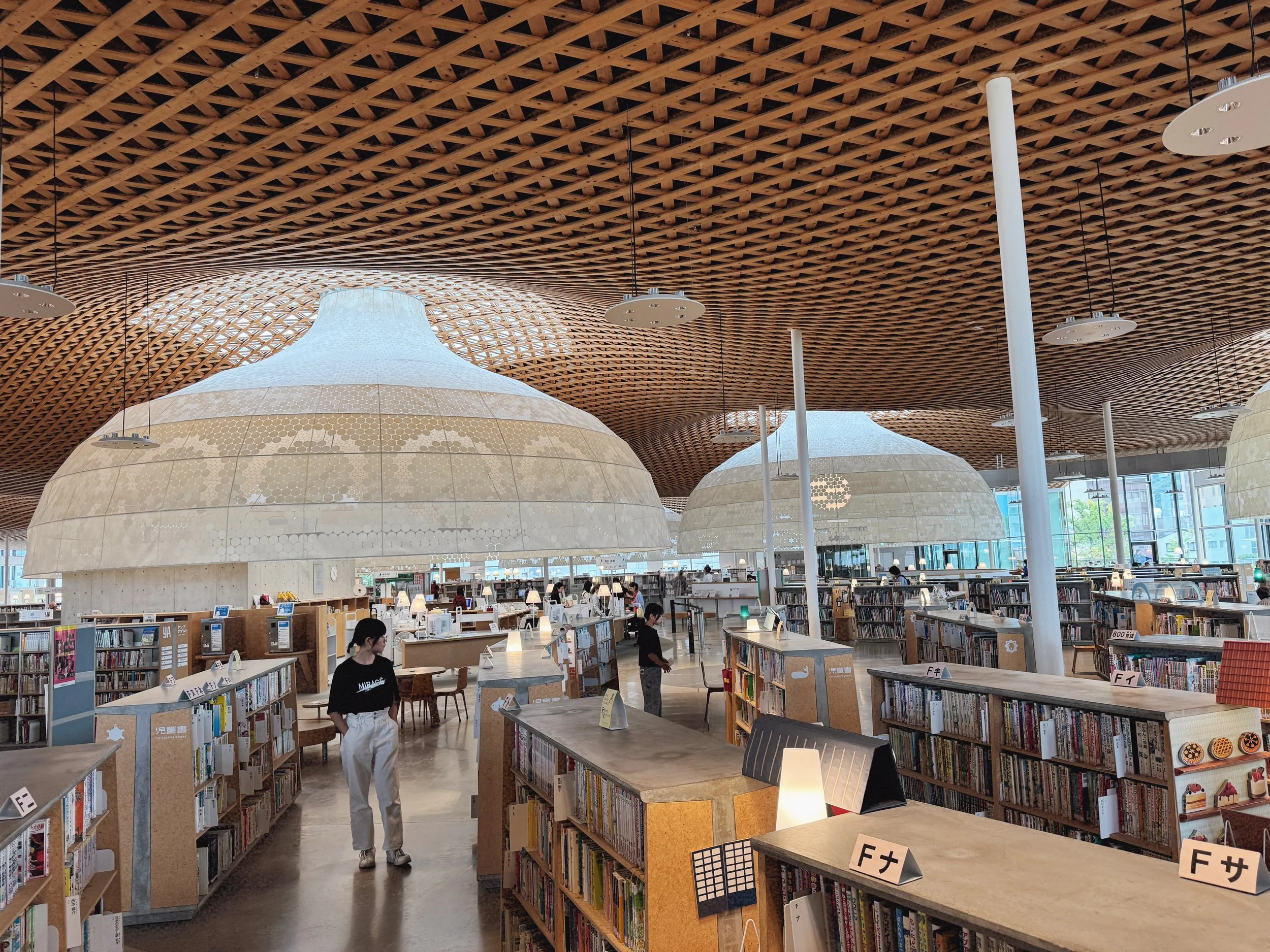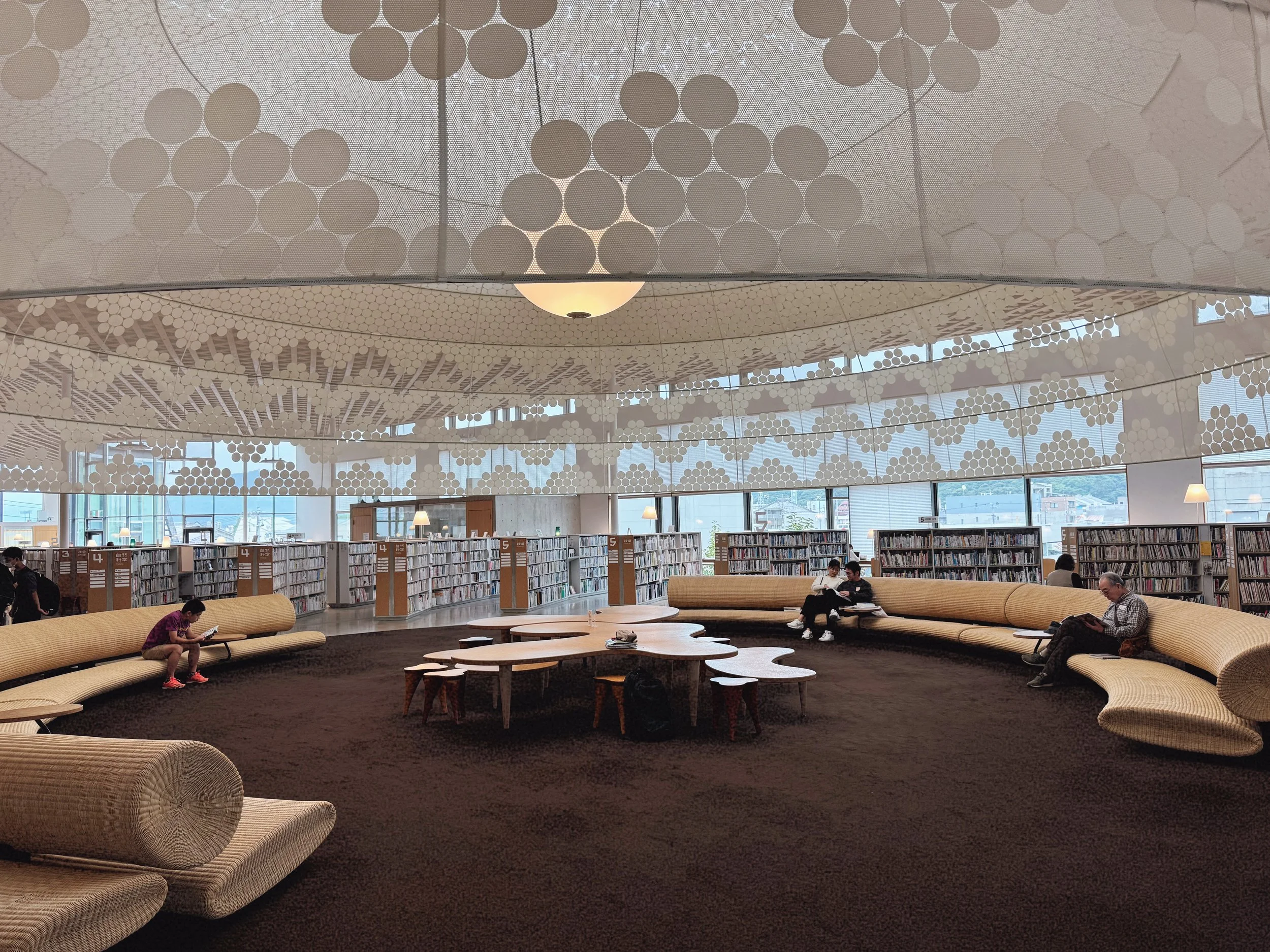 Minna no Mori (Everyone’s Forest) Media Cosmos, a municipally led civic and cultural project in Gifu City, is housed in a stunning building by Toyo Ito. Its sweeping organic wooden lattice structures, suggestive of mycelial forms, cast a warm, diffuse light over an expansive library, workshops, galleries, and spaces for education and cultural exchange. The space is filled with members of the community from every generation: learning, playing, reading, and working within a structure that clearly expresses profound respect for the people and values that animate it. When I asked the reference librarian about an artist I was researching, she kindly asked me to return at the end of my visit, at which point she presented me with a brimming folder of carefully compiled resources and suggestions for further inquiry.