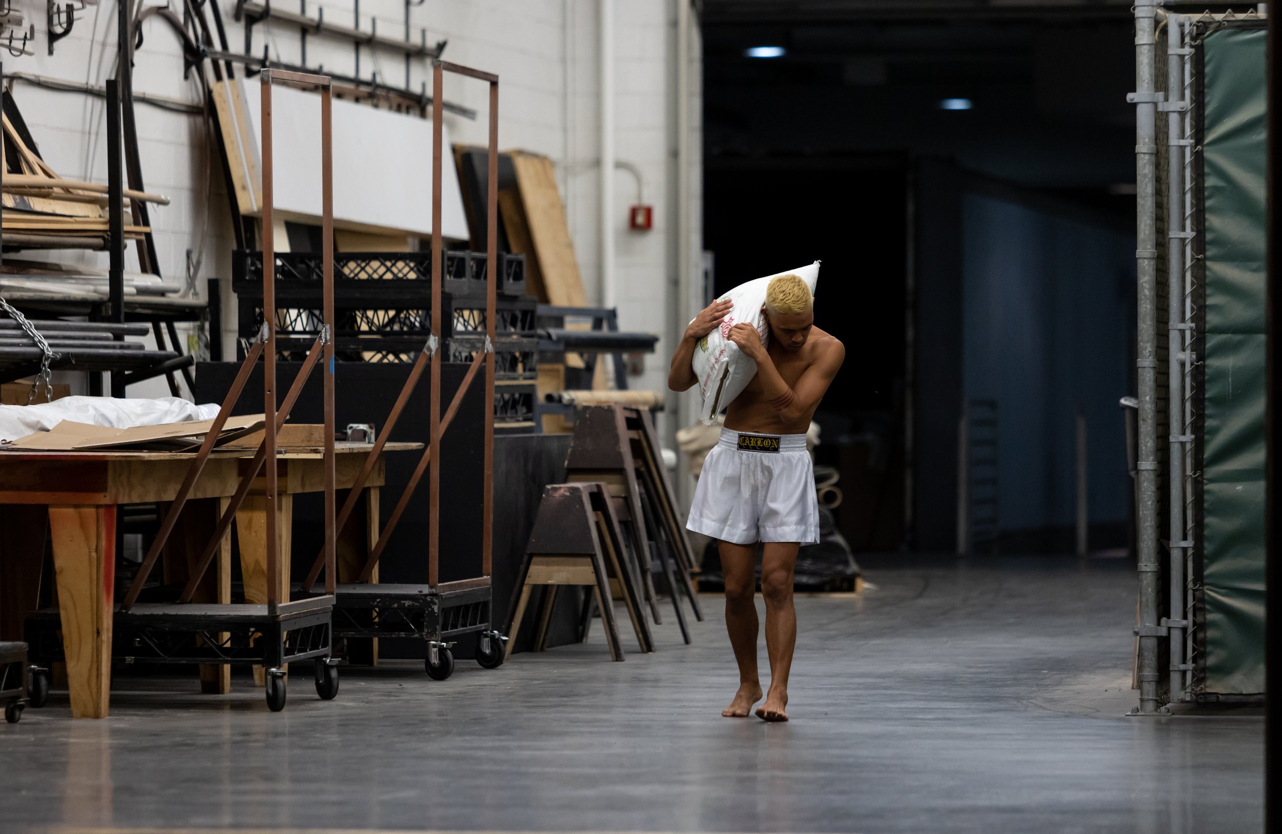 James Baldwin once wrote, “People are trapped in history and history is trapped in them.” For rising choreographer and dancer Jay Carlon, the history and the colonial turmoils of the Filipinx experience is as heavy as a gunny sack of rice. As part of the REDCAT NOW Festival, Carlon presented his tender and prescient performance, Novena, at the CalArts Theater in Downtown Los Angeles with singer and sound artist Micaela Tobin. Historically, Novena—from the Latin word for nine—is a multi-day devotional ritual for grieving and healing, a transmutational practice of turning suffering into acceptance. Over the course of Carlon’s performance, this metamorphosis is slow, quiet and beautiful, like a lepidoptera emerging from a cocoon, body first, then legs, then wings, then flying into the unknown. Novena starts with the backstage wide open, lights on, fluorescent, exposed, the theater as a naked object. The first thing you recognize is someone riding an industrial floor polisher, the hooks, the ladders, the wires behind the stage symbolically exposed. A nod to the invisible workers, the culturally vanished. Carlon, in just a pair of boxing shorts, emerges with a sack of rice as Tobin gives her somber soprano chorus.