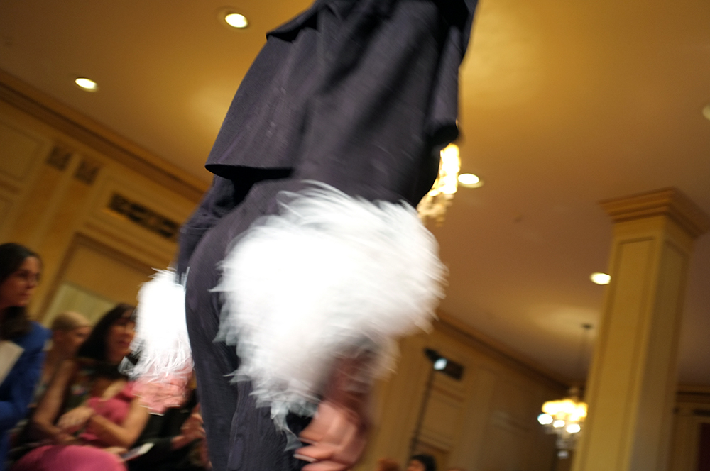 In Rachel Comey's daring new pre-spring collection vivid colors, along with delicate, varying textures and proportions abound as she responds to the current moment. A moment emboldened by an undercurrent of resistance and irreverence towards dominant structures long overdue for upheaval. Setting the stage of her runway show at the old Bullocks Wilshire department store where Helen Gurley Brown used to be a secretary and Angela Lansbury was a salesclerk, she takes inspiration from the space by embellishing materials and decorating the silhouettes themselves - layering tulle belts over zebra denim or colorblocked wool trousers. Hand cut and dyed flowers dangle from the ear, sit at the neck or frame the face. A zebra jacquard is used for volume on top and to finish the look in a purposeful wedge sandal. In the spirit of Katherine Hepburn who used to shop here for shoes in the men's department, she has proposed new tuxedos and other alternative ideas for event dressing. Fringe and rhinestone decorate the legs and feathers are used in one gesture at the neck or from the ear, while in other moments the body is stripes.
