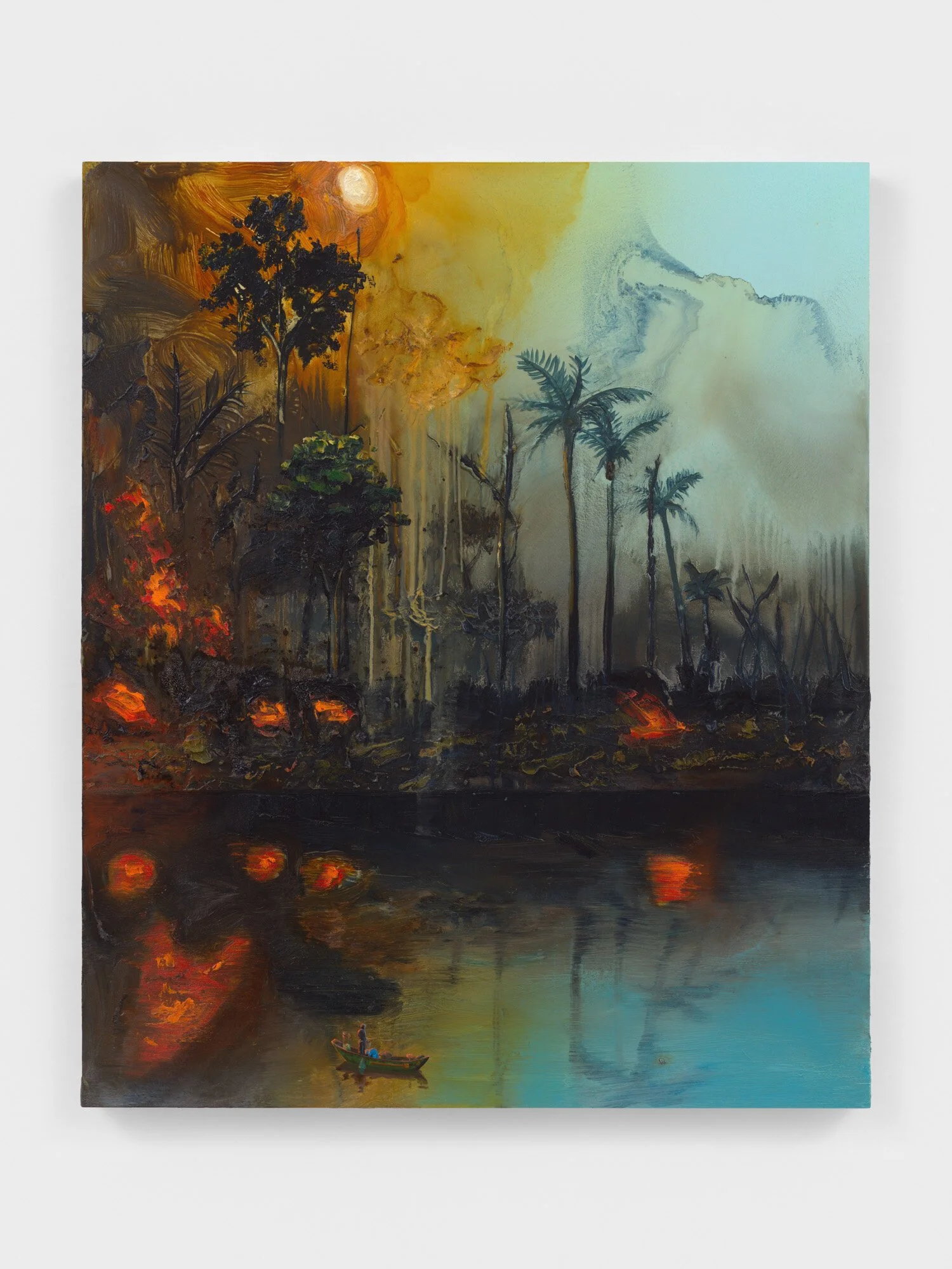 Fire pervades Alexis Rockman’s paintings, on view now at Jack Shainman Gallery in Chelsea. Fires burn down forests, pollute the atmosphere, and even rage through snowy environs. Small nascent flames feel more ominous than those that have left entire forests ashen, as we can easily foresee the death to come. Rockman portrays bodies of water in the foreground, as if he has retreated to the one place where fire can’t burn. These bodies reflect much of the devastation on land, as well as the exhibition’s title, Feedback Loop. They emphasize the accelerating nature of this destruction. The works’ titles—including Karaikal Beach (India), Lake Tanganyika (East Africa), Osa Peninsula (Costa Rica)—attest to a global reckoning that is pointedly addressed when viewing the series as a whole.