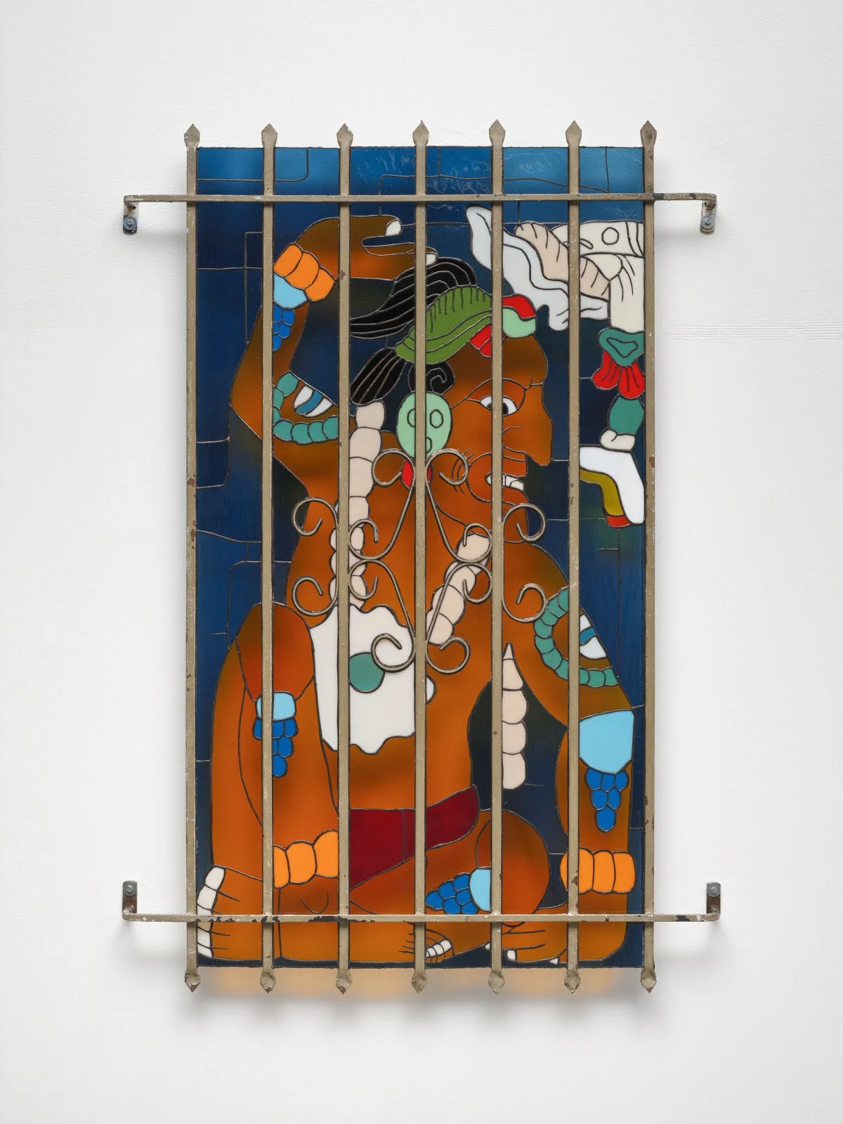 fahler’s “SKYBEARER” in stained glass is set behind rusting window bars. This is one of the four deities responsible for holding up the sky, separating it from Earth, and making mortal life possible. His incarceration might explain what has gone so terribly wrong with the cosmic order.