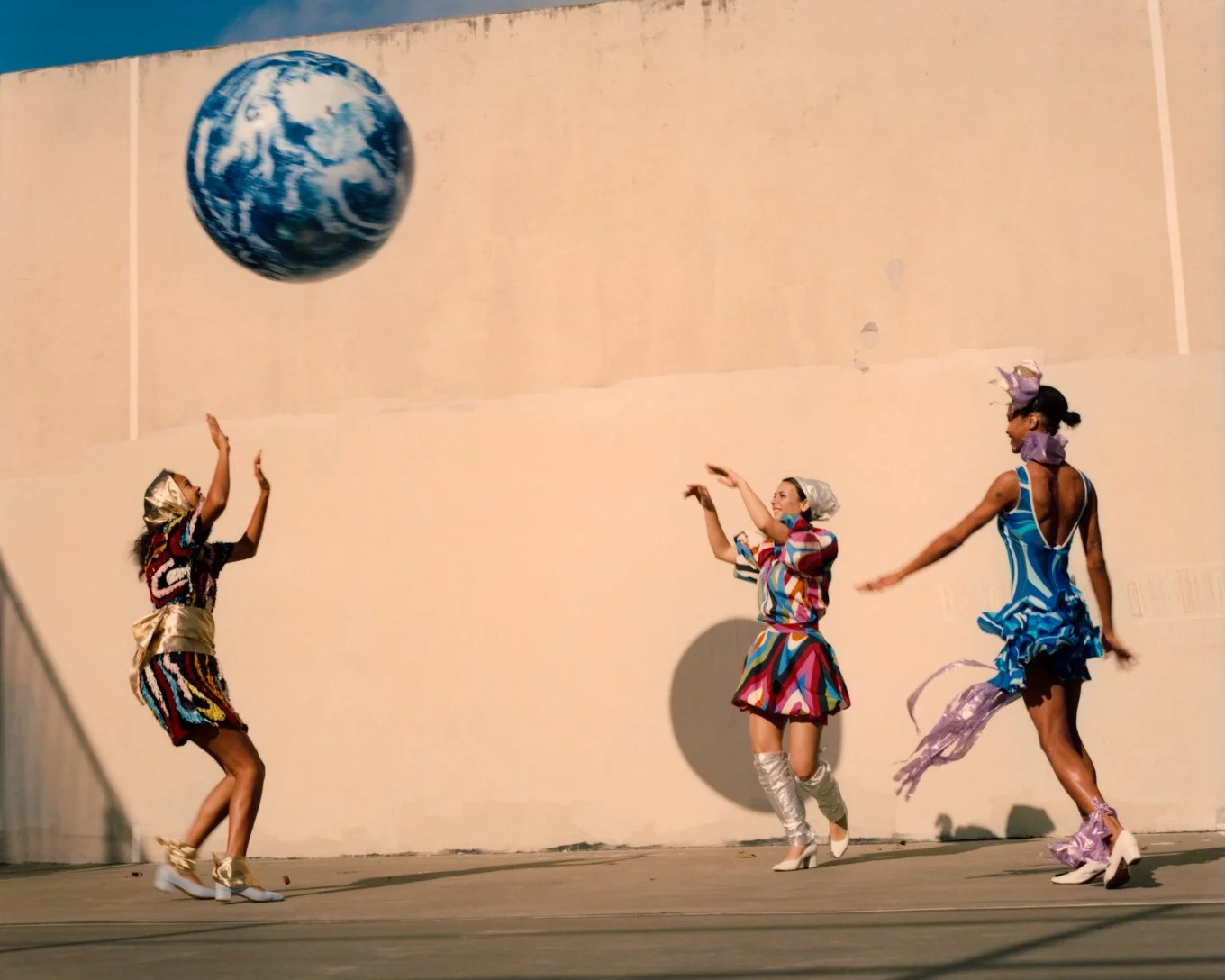 (left to right) Amandine wears Pucci sequined nylon dress; Mikala wears Pucci lycra dress; Ayan wears Pucci lycra dress. All wear Shayna Arnold metallic lamé head scarf, belt, and leg bands, and Maryam Nassir Zadeh leather shoes