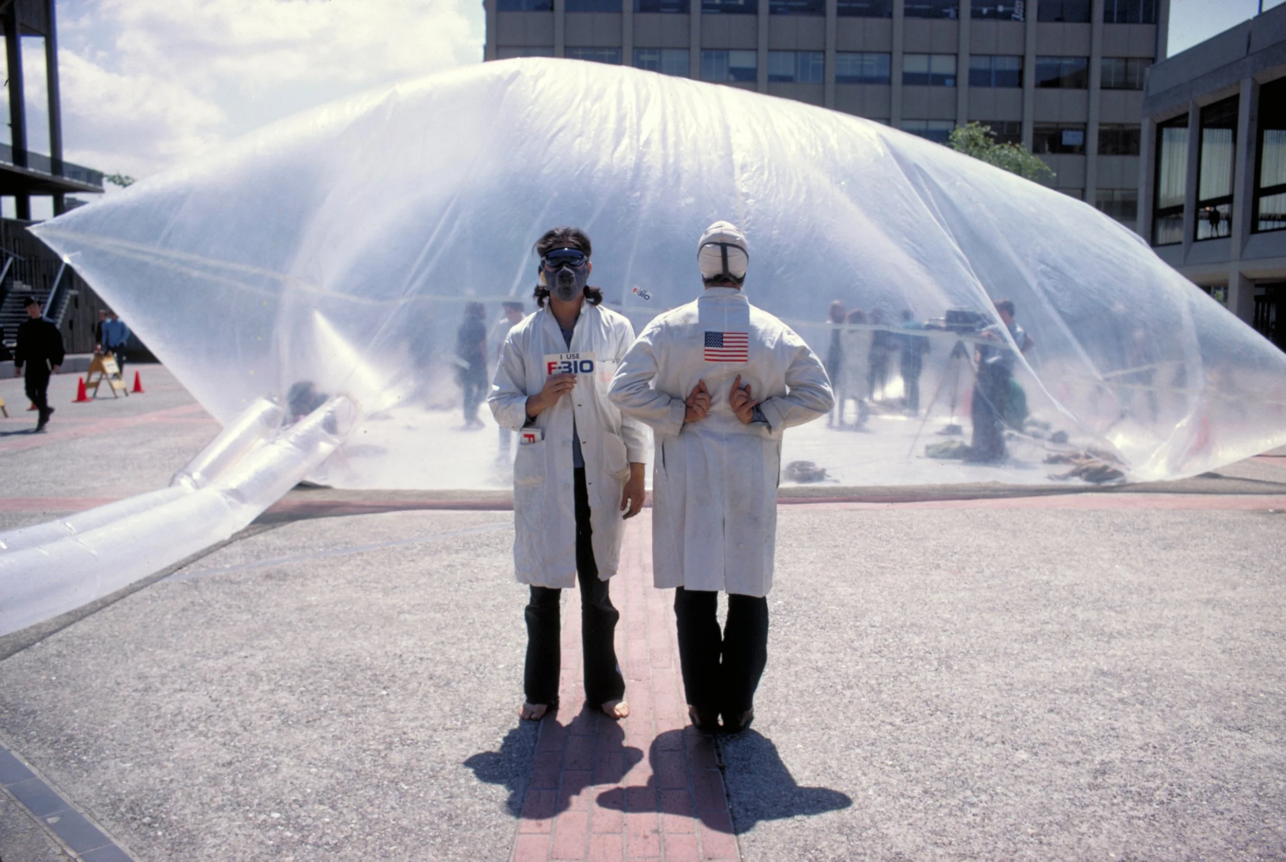 Clean Air Podperformance by Ant Farm, U.C. Berkeley, Sproul Plaza, Earth Day, 1970(Andy Shapiro and Kelly Gloger pictured) courtesy Chip Lord